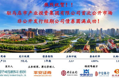 10月27日,市產(chǎn)業(yè)集團(tuán)首次在公開市場非公開發(fā)行短期公司債劵圓滿成功,發(fā)行規(guī)模5億元,期限1年,利率4.8%,主承銷商為平安證券。此次債券發(fā)行成功意味著市產(chǎn)業(yè)集團(tuán)向資本市場邁出了堅實的一步,實現(xiàn)資本市場融資新的突破,充分說明資本市場對市產(chǎn)業(yè)集團(tuán)品牌效應(yīng)和綜合實力…